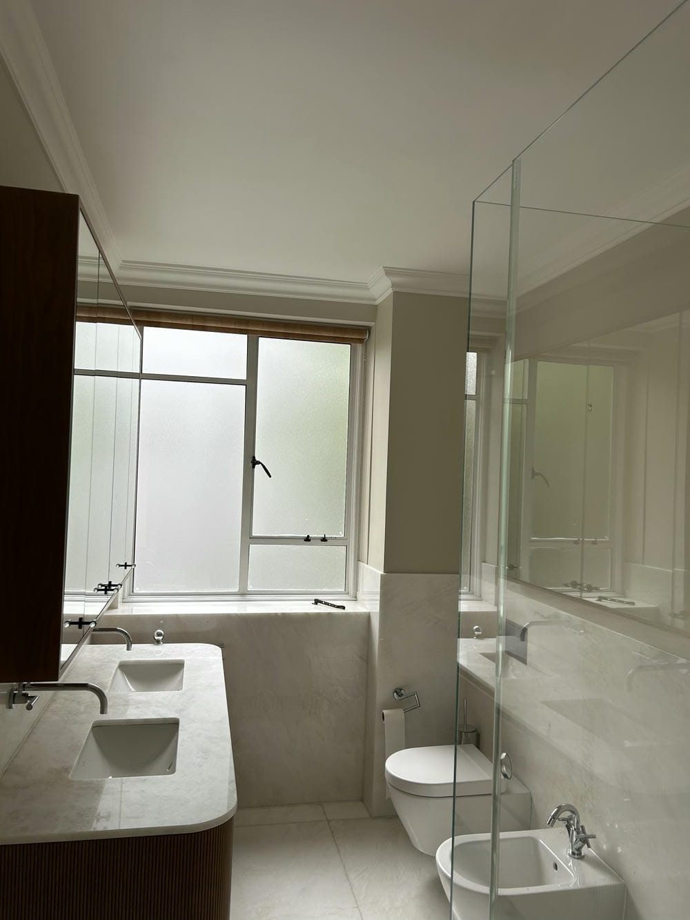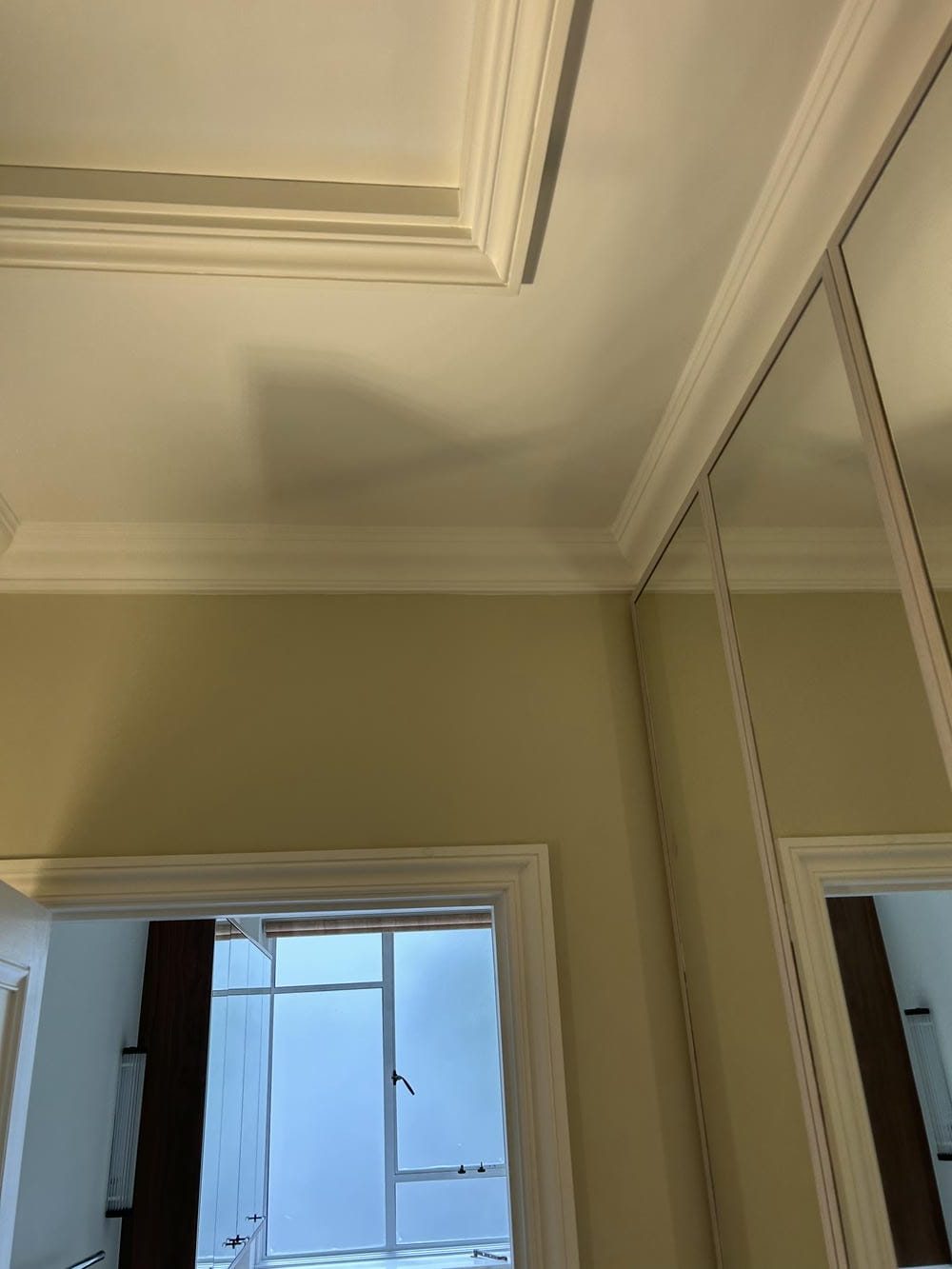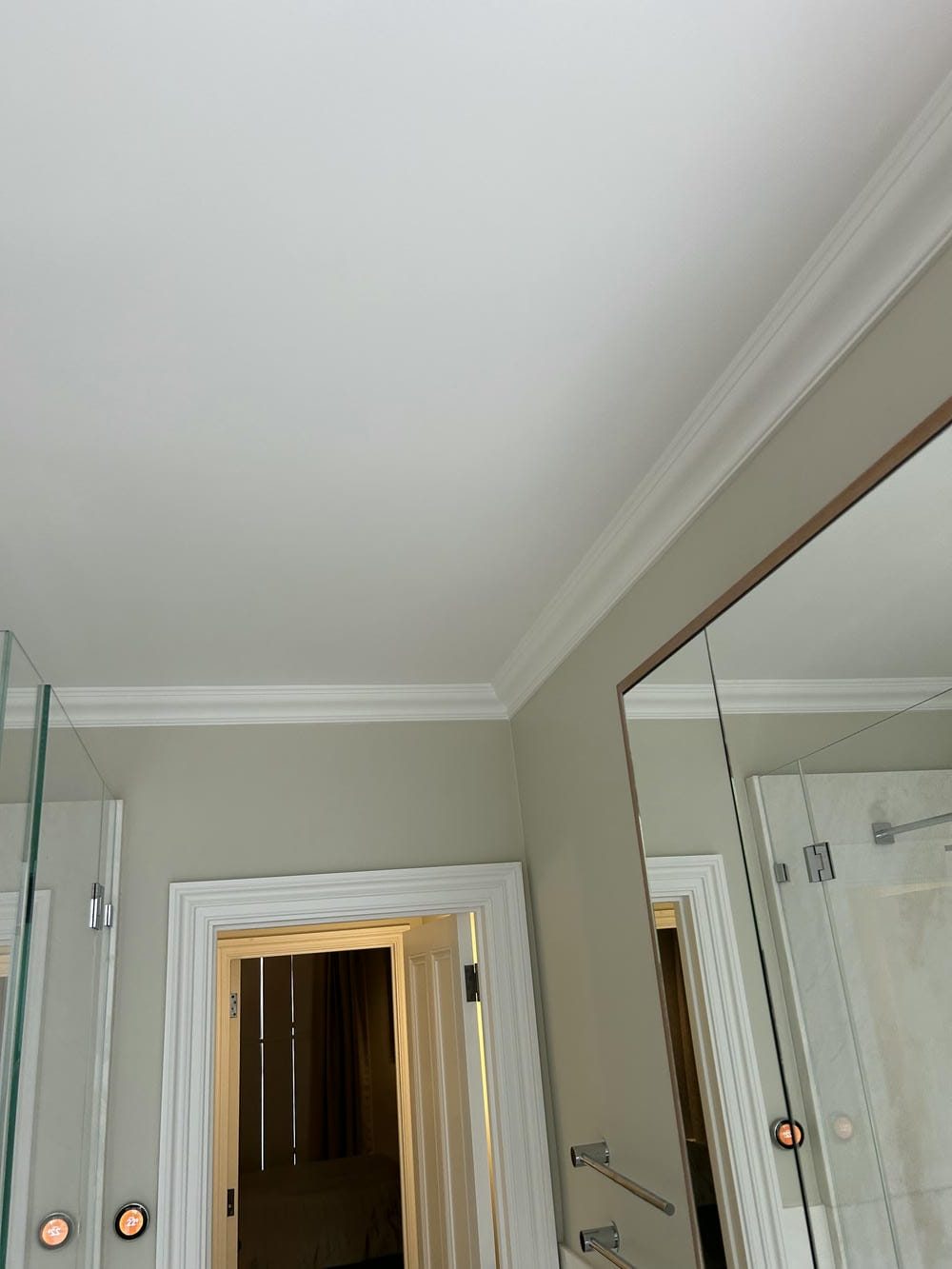 Restoration of two bathrooms and a dressing room following water damage. Situated in a prime Chelsea/South Kensington location, the property is finished to a high standard. Our protection was meticulous as always, with precise filling and sanding, stain blocking, and a flawless finish using designer paints from Paint & Paper Library and Farrow & Ball.